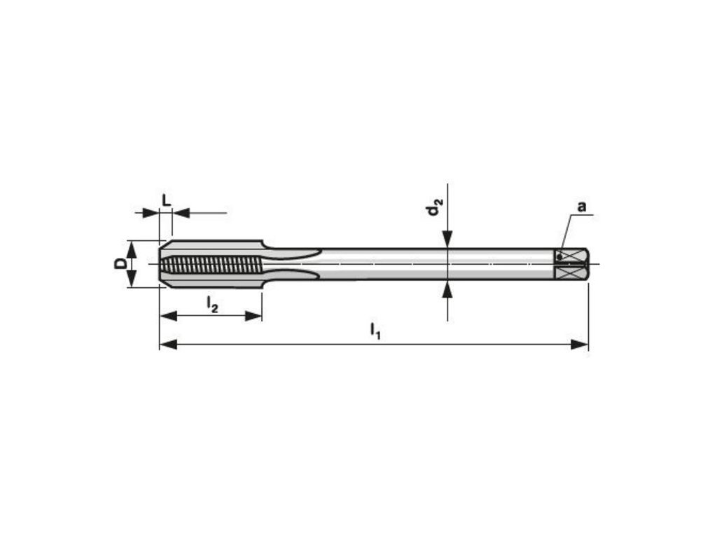 Typ závitu: MF - jemný metrický závit Norma: DIN 374 Materiál: HSS - výkonná rýchlorezná oceľ Lícovanie: 2N Rezný kužeľ: C/2P Rozmer závitu: D = 12 mm Stúpanie závitu: P = 1,5 mm Celková dĺžka: l1 = 100 mm Dĺžka reznej časti: l2 = 22 mm Priemer drieku: d2 = 9,0 mm Rozmer štvorhranu: a = 7,0 mm Priemer vyvŕtanej diery: ⌀ = 10,50 mm Uhol: 60 ° Odporúčané použitie: Konstrukčné ocele nelegované s pevnosťou do 500 MPa, nízko a stredne legované ocele do 800 MPa, nástrojové ocele do 500 MPa, temperované zliatiny, a termoplasty, uhlíkové ocele na odliatky s pevnosťou do 750 MPa, šedé liatiny, tvárne liatiny, mosadz s krátkou drobivou trieskou, mosadz s dlhou celistvou trieskou, zinok a jeho zliatiny, reaktoplasty a duroplasty. Možné použitie: Nástrojové ocele legované do 900 MPa, bronz, meď, hliník legovaný.Dodatočné parametre