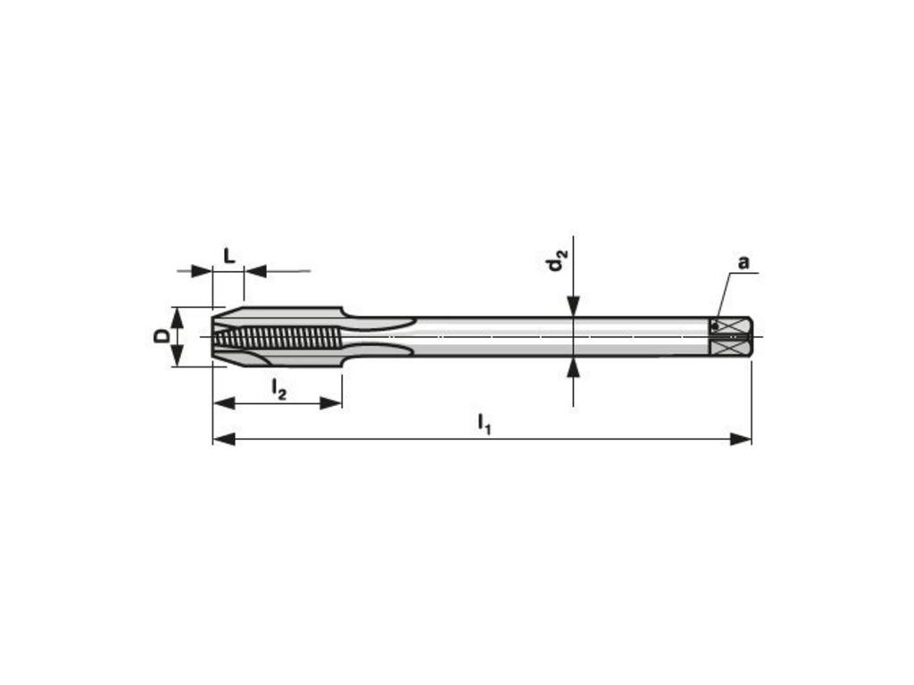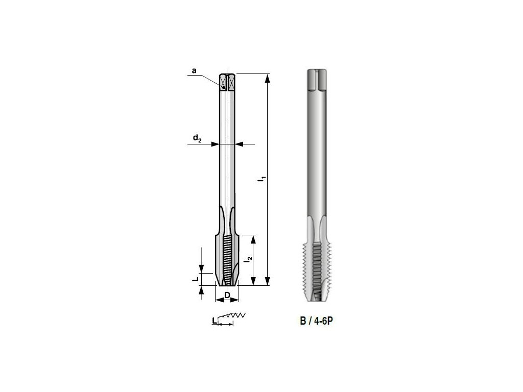 Typ závitu: metrický závit Norma: DIN 376 Materiál: HSS - výkonná rýchlorezná oceľ Lícovanie: 2N Rezný kužeľ: B/4-6P Rozmer závitu: D = 16 mm Stúpanie závitu: P = 2,0 mm Celková dĺžka: l1 = 110 mm Dĺžka reznej časti: l2 = 32 mm Priemer drieku: d2 = 12,0 mm Rozmer štvorhranu: a = 9,0 mm Priemer vyvŕtanej diery: ⌀ = 14,00 mm Uhol: 60 ° Odporúčané použitie: Konstrukčné ocele nelegované s pevnosťou do 500 MPa, nízko a stredne legované ocele do 800 MPa, nástrojové ocele do 500 MPa, temperované zliatiny, a termoplasty, uhlíkové ocele na odliatky s pevnosťou do 750 MPa, šedé liatiny, tvárne liatiny, mosadz s krátkou drobivou trieskou, mosadz s dlhou celistvou trieskou, zinok a jeho zliatiny, reaktoplasty a duroplasty. Možné použitie: Nástrojové ocele legované do 900 MPa, bronz, meď, hliník legovaný.Dodatočné parametre